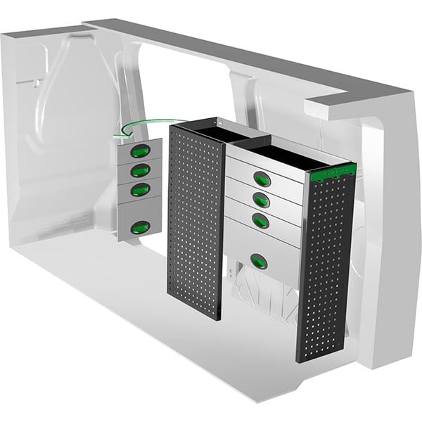 Découvrez un aménagement de véhicule utilitaire professionnel avec ce système Edström en métal, conçu pour une installation sur le côté arrière droit du véhicule. Cette solution se compose de 2 tablettes résistantes pour le rangement courant, ainsi que de 2 rangées de 4 tiroirs, offrant un total de 8 tiroirs sécurisés pour organiser et protéger vos outils, pièces ou fournitures.
