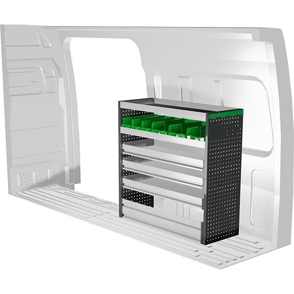 Ce kit d’aménagement en métal Edström, installé sur le côté droit du véhicule, offre une solution de rangement structurée, robuste et facilement accessible, parfaitement adaptée aux exigences du travail mobile.