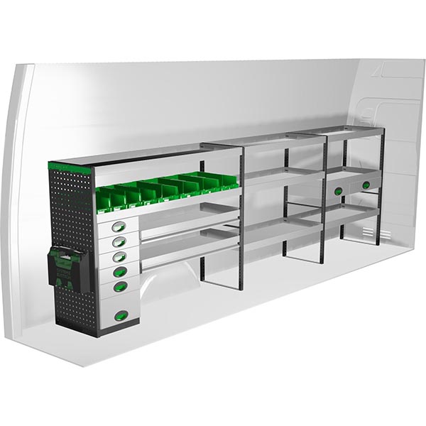 Ce kit d’aménagement en métal Edström est conçu pour le côté gauche du Mercedes Sprinter 3 L3H2, offrant une solution de rangement complète, fonctionnelle et parfaitement adaptée aux besoins des professionnels. À l’avant gauche, le module comprend trois grandes étagères avec un espace de stockage important, ainsi que deux tiroirs pour le rangement sécurisé de l’outillage ou du petit matériel. Au centre, on retrouve trois autres étagères avec de grands volumes, idéales pour entreposer du matériel encombrant ou des caisses de transport.