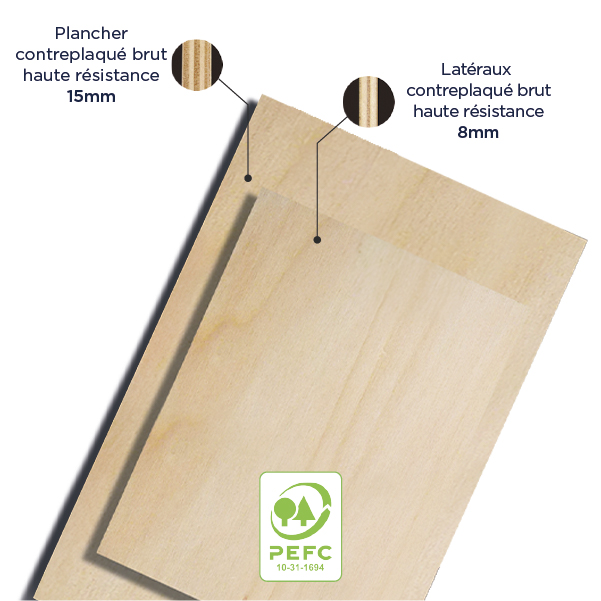 Avec un plancher en contreplaqué brut de 15 mm et des panneaux latéraux en contreplaqué brut de 8 mm, cette finition offre une solidité renforcée, idéale pour un usage intensif. Compatible avec les aménagements Optipro et les casiers Optimum, elle répond à vos besoins d’organisation et de personnalisation.