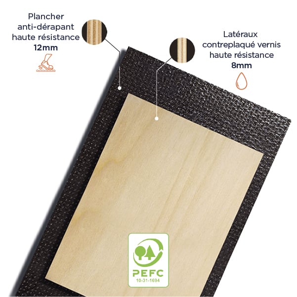 Avec un plancher antidérapant de 12 mm et des panneaux latéraux en contreplaqué verni anti-UV de 8 mm, elle assure non seulement une solidité exceptionnelle mais aussi une finition esthétique et durable. Parfaite pour un usage très intensif, cette solution est idéale pour les professionnels exigeants qui souhaitent allier robustesse et élégance.