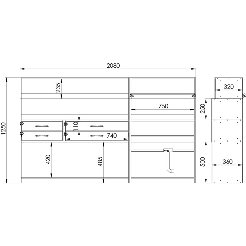Dimensions côté gauche L=2080 / H=1250 / P=360mm