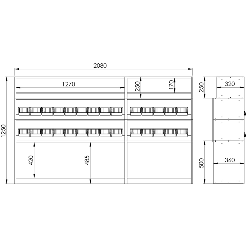 Dimensions côté gauche L=2080 / H=1250 / P=360mm