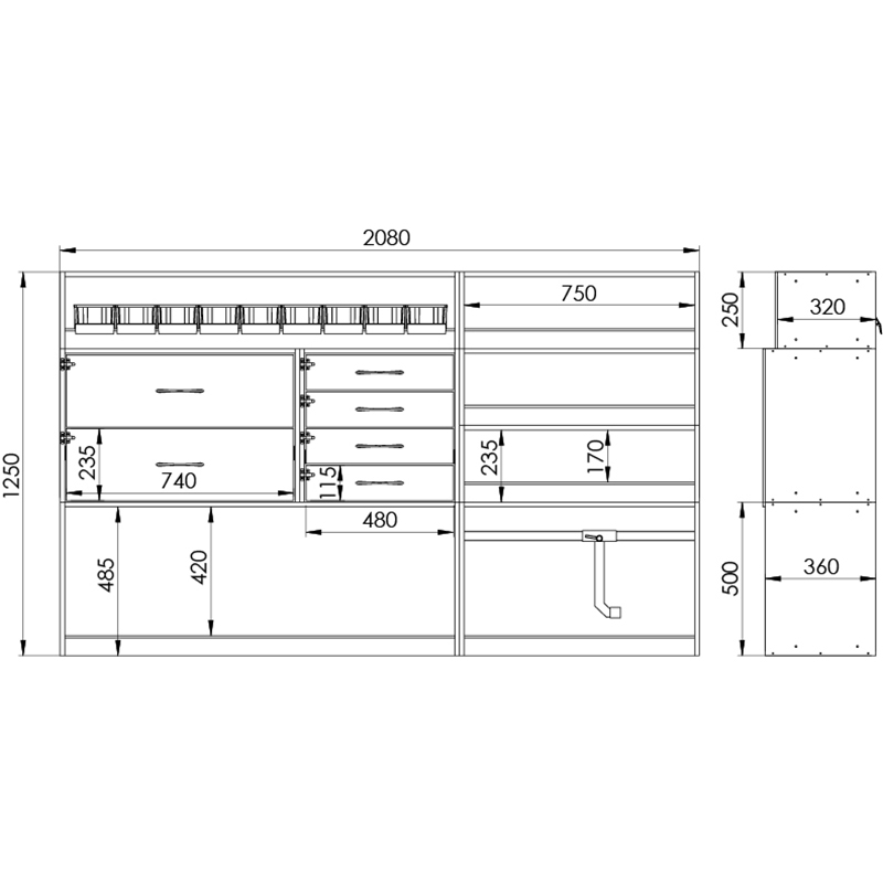 Dimensions côté gauche L=2080 / H=1250 / P=360mm