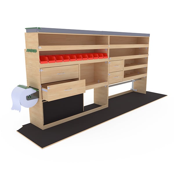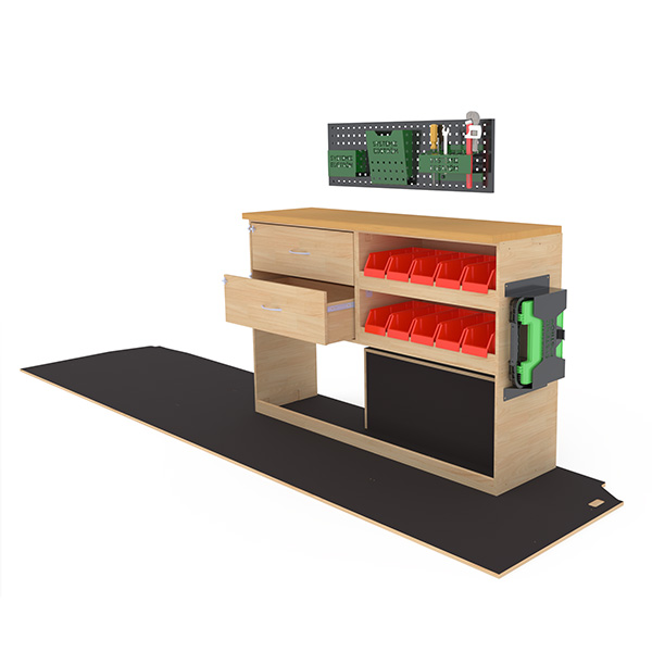 L’ensemble transforme votre utilitaire en un poste de travail mobile, parfaitement organisé et prêt à l’emploi dès l’ouverture des portes.